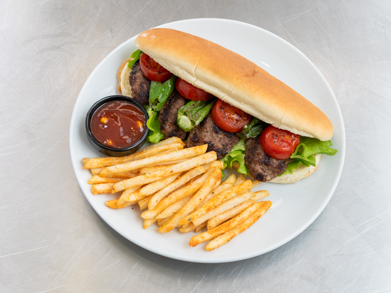 Sandviç ekmeği içerisinde özel el yapımı köfte, yeşillik, domates ve patates kızartması ile servis edilir.