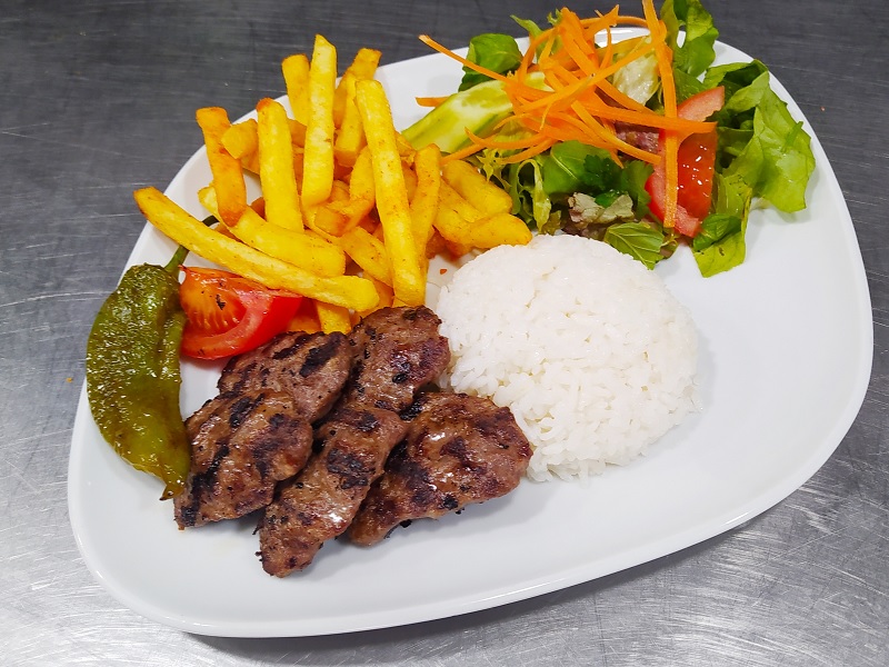 Özel el yapımı et köfte, pirinç pilavı, patates kızartması ve salata ile servis edilir.