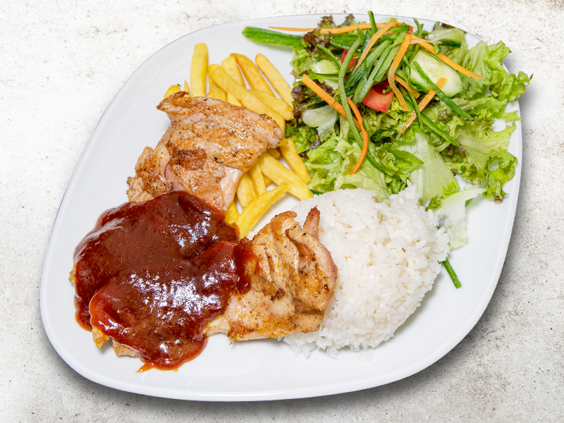 Tavuk but ızgara üzerinde kansas sos, patates kızartması, pirinç pilavı ve salata ile servis edilir.