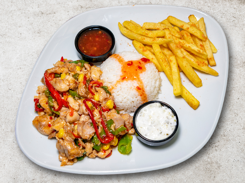Julyen tavuk, renkli biberler, sweet chili sos ( tatlı acı sos ), pirinç pilavı, özel baharat soslu patates kızartamıs ile servis edilir.