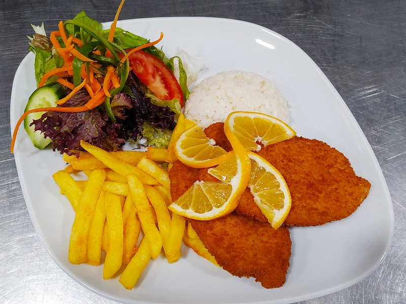Tavuk şinitzel, pirinç Pilavı, patates kızartması ve salata ile servis edilir.