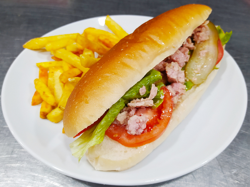 Sandviç ekmeği arasında ton balığı, yeşillik, turşu, domates ve yanında özel baharat soslu patates kızartması ile servis edilir.